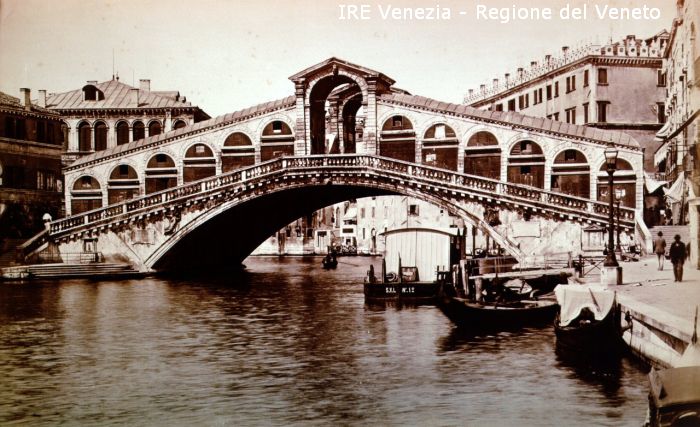 Venezia - Vedute, monumenti, luoghi - Centro storico - Canal Grande - Ponte di Rialto - Riva del Ferro - Pontile di Rialto - Persone - Gondole - Gondolieri