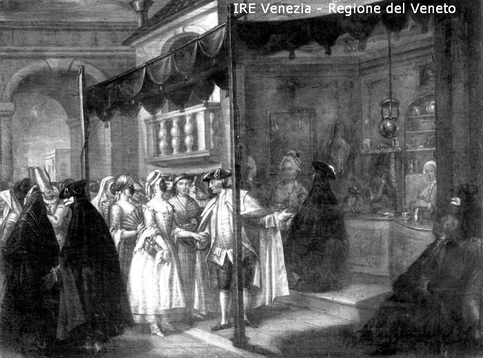 Venezia, proprietà Ravà, riproduzione dipinto, pittore n.c., scena carnevalesca