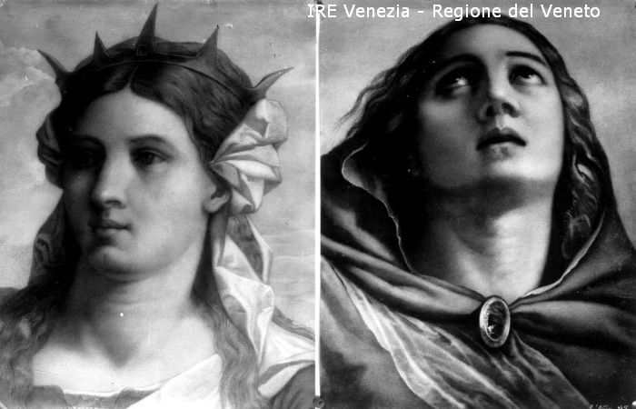 Venezia, chiesa di Santa Maria Formosa, riproduzione dipinti, Palma il Vecchio, particolare S. Barbara, chiesa dei Frari, Tiziano, particolare dell'Assunta di Filippi, Tomaso (XX)