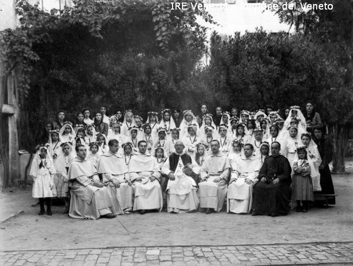 S. S. Giovanni e Paolo - Ritratti: di gruppo, all'esterno, figure intere - Bambine: comunicande - Vestiario: abiti bianchi, velo, coroncine con fiori - Frati Domenicani - Donne - Sfondo: cortile, alberi, piante