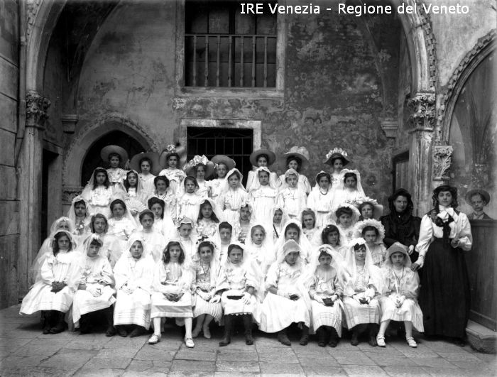 S. S. Giovanni e Paolo - Ritratti: di gruppo, all'esterno, figure intere - Bambine: comunicande - Vestiario: abiti bianchi, velo, guanti, cappelli con nastri - Donne: due - Sfondo: cortile, finestre, porte