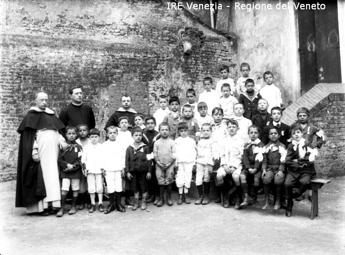 S. S. Giov. e Paolo - Ritratti: di gruppo, all'esterno, figure intere - Bambini: trentuno - Uomini: tre, religiosi, frati - Sfondo: muro in mattoni, scala, portone, panchina