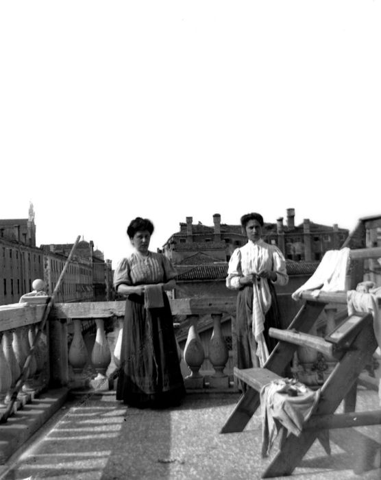 Componenti della famiglia Filippi sulla terrazza di casa - Ritratti: all'esterno, figure intere, frontali - Donne: due, in piedi - Sfondo: terrazzo, case, tetti