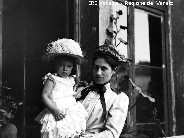 Ritratto della moglie Angela Vorano con la piccola Clara - Ritratti: all'esterno - Donna: in piedi, tiene in braccio la bambina - Vestiario: abiti chiari, cappelli - Sfondo: terrazzo, finestra, piante