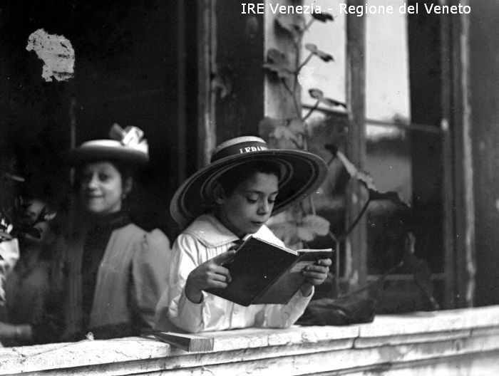 Ritratto di Aldo Filippi - Ritratto: all'esterno, mezza figura, in semi profilo - Bambino: appoggiato ad una balaustra, legge - Vestiario: camicia bianca, fiocco a pois, cappello - Fondale: terrazzo, finestra, pianta, bambina