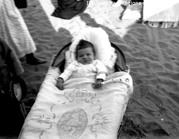 Lido di Venezia, bambino in culla sulla spiaggia di Filippi, Tomaso (XX)