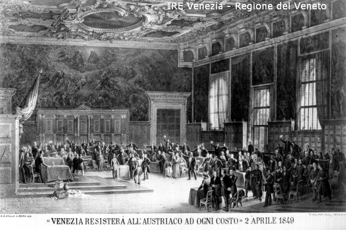 "Venezia resisterà all'Austriaco ad ogni costo, famosa seduta in Pal. Ducale" - G.B. Dalla Libera (sul coperchio della scatola)