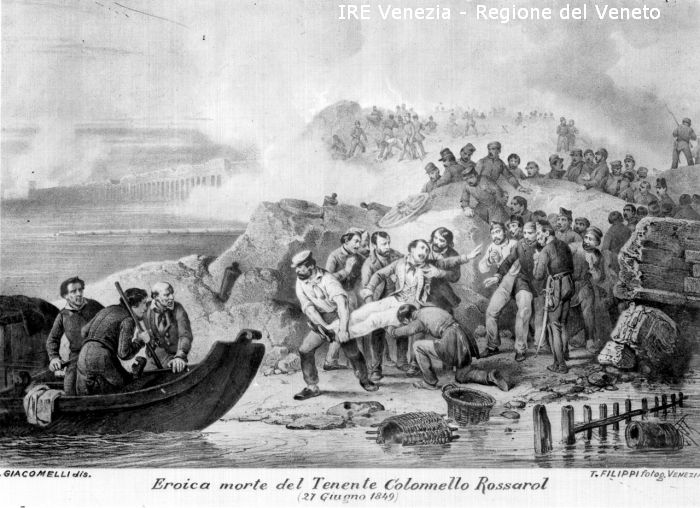 "Morte del Ten.te Colonello Rossarol, 27 ott. 1848" - Ultime parole V. Giacomelli, "Ai vostri ... amici! Salvate il forte e lasciate che io muoia" (sul coperchio della scatola)