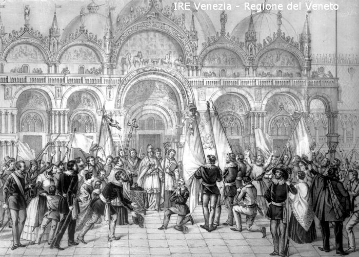 "Benedizione della Bandiera Italiana e quella di S. Marco, 23 marzo 1848" (sul coperchio della scatola)
