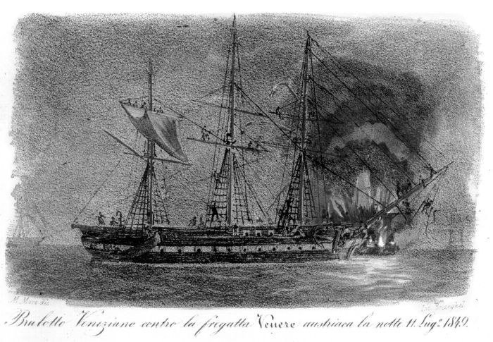 "Burlotto Veneziano contro la fregata Venere Austriaca 1a, notte 11 luglio 1849 - Co. Moro" (sul coperchio della scatola)