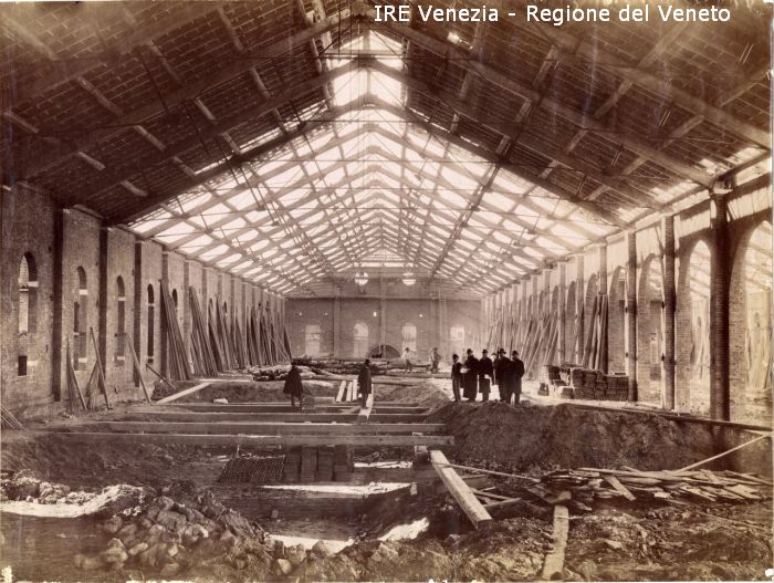 Venezia - Vita veneziana e lagunare - Attività private - Progetti e Cantieri - Capannone di una fabbrica di conterie a Murano (in costruzione ?) - Persone - Operai