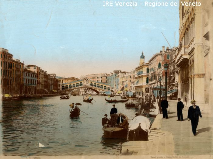 Venezia - Vedute, monumenti, luoghi - Centro storico - Canal Grande - Ponte di Rialto - Riva del Vin - Riva del Carbon - Pontile di Rialto - Persone - Gondole - Gondolieri