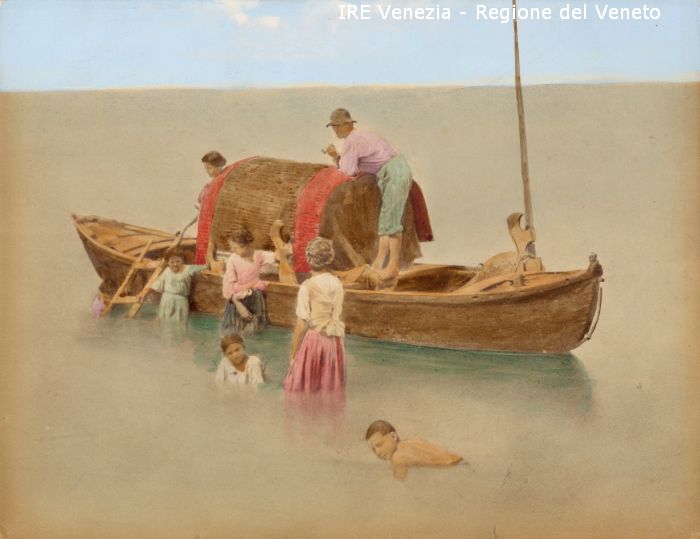 Venezia - Vita veneziana e lagunare - Pescatori e imbarcazioni da pesca - Laguna di Venezia - Imbarcazione: topo, con tendalino - Un uomo con pipa e cappello: a bordo - Quattro bambini e una donna: in acqua - Una donna: a bordo vicino alla scaletta