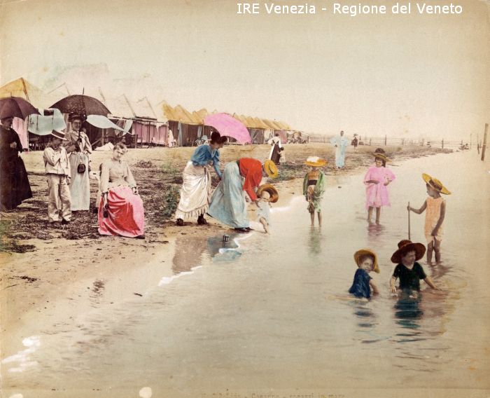 Venezia - Vita veneziana e lagunare - Scene e costumi - Lido di Venezia: spiaggia - Stabilimento bagni - Signore: sulla battigia; vestite, con l'ombrellino - Bambini: in acqua - Capanne