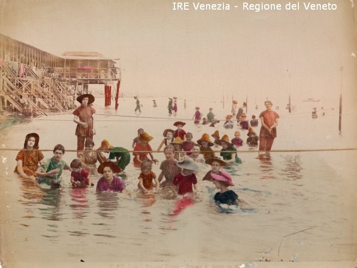 Venezia - Vita veneziana e lagunare - Scene e costumi - Lido di Venezia: spiaggia - Stabilimento bagni - Gruppo di persone in acqua - Capanne