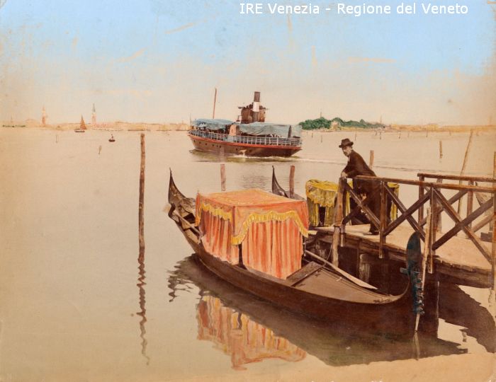 Venezia - Vedute, monumenti, luoghi - Isole e Laguna - Lido di Venezia - Approdo - Uomo sul pontile di S. Maria Elisabetta - Gondola con felze - Traghetto a vapore con passeggeri