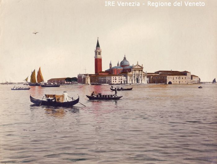 Venezia - Vedute, monumenti, luoghi - Centro storico - Bacino di S. Marco - Isola di S. Giorgio Maggiore - Imbarcazioni - Barca a vela - Gondole - Gondolieri