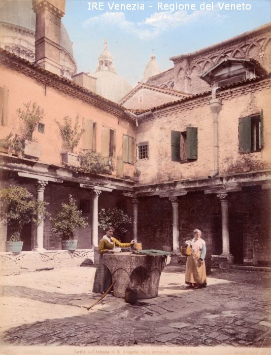Venezia - Vedute, monumenti, luoghi - Centro storico - Calli, Campi, Luoghi - Santa Croce - Abbazia di S. Gregorio: chiostro - Donne presso un pozzo: due