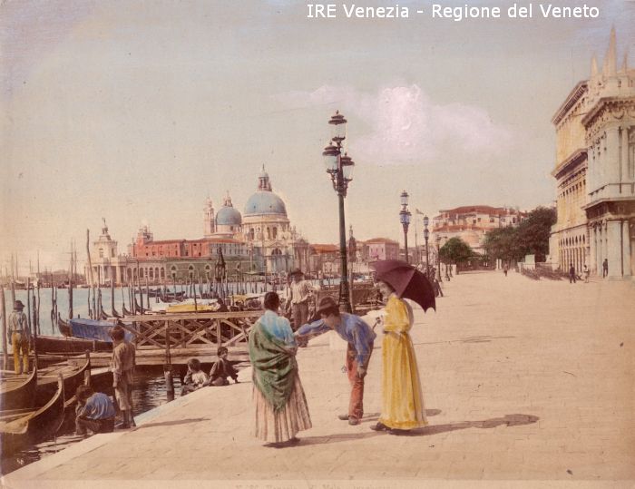 Venezia - Vedute, monumenti, luoghi - Centro storico - Area Marciana - Molo: ripreso da est - Biblioteca Marciana - Zecca - Punta della Dogana - Chiesa di S. Maria della Salute - Gondole ormeggiate - Gondolieri - Persone - Bambini