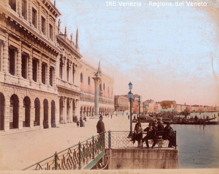 Venezia - Vedute, monumenti, luoghi - Centro storico - Area Marciana - Molo: ripreso da ovest (dal Giardinetto Reale) - Zecca - Biblioteca Marciana - Colonna di S. Marco - Palazzo Ducale - Riva degli Schiavoni - Persone - Gondole