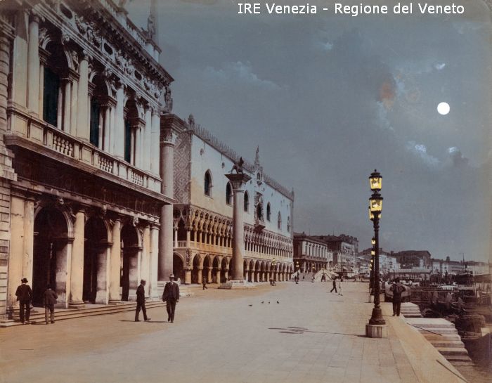 Venezia - Vedute, monumenti, luoghi - Centro storico - Area Marciana - Molo: ripreso da ovest - Biblioteca Marciana - Colonna di S. Teodoro - Colonna di S. Marco - Palazzo Ducale - Ponte della Paglia - Prigioni Nuove - Riva degli Schiavoni - Persone