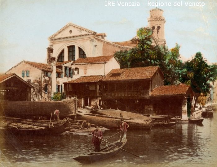 Venezia - Vedute, monumenti, luoghi - Centro storico - Canali e Rii - Dorsoduro - Rio di S. Trovaso o delle Maravege - Squero di S. Trovaso - Chiesa di S. Trovaso - Persone - Barche - Uomini che remano: due