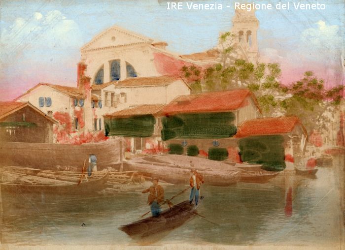Venezia - Vedute, monumenti, luoghi - Centro storico - Canali e Rii - Dorsoduro - Rio di S. Trovaso o delle Maravege - Squero di S. Trovaso - Chiesa di S. Trovaso - Persone - Barche - Uomini che remano: due