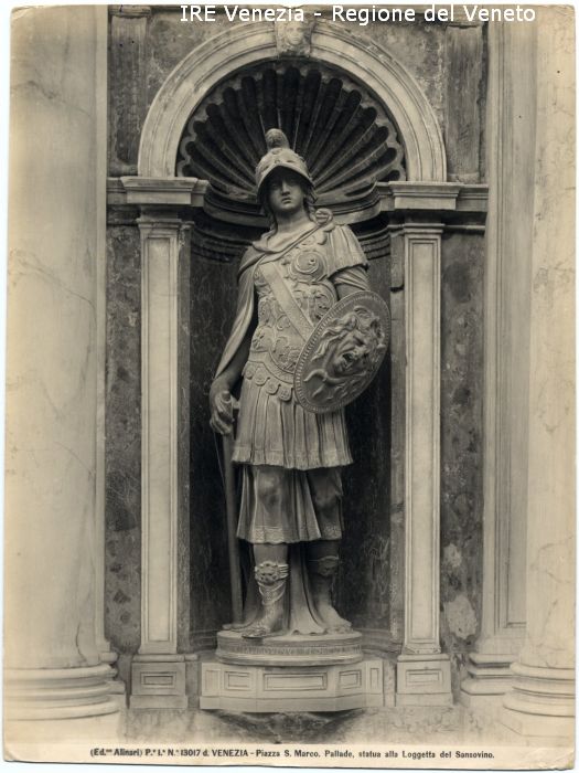 - ISCRIZIONI sul recto: nell'etichetta didascalica sotto l'immagine: al centro - (Ed.ne Alinari) P.e I.a N.° 13017 d. VENEZIA - Piazza S. Marco. Pallade, statua alla Loggetta del Sansovino. - fotografica -