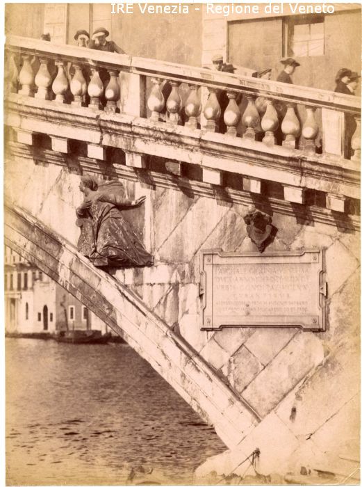 Venezia - Vedute, monumenti, luoghi - Centro storico - Canal Grande - Ponte di Rialto - Targa commemorativa - Persone affacciate alla balaustra del ponte