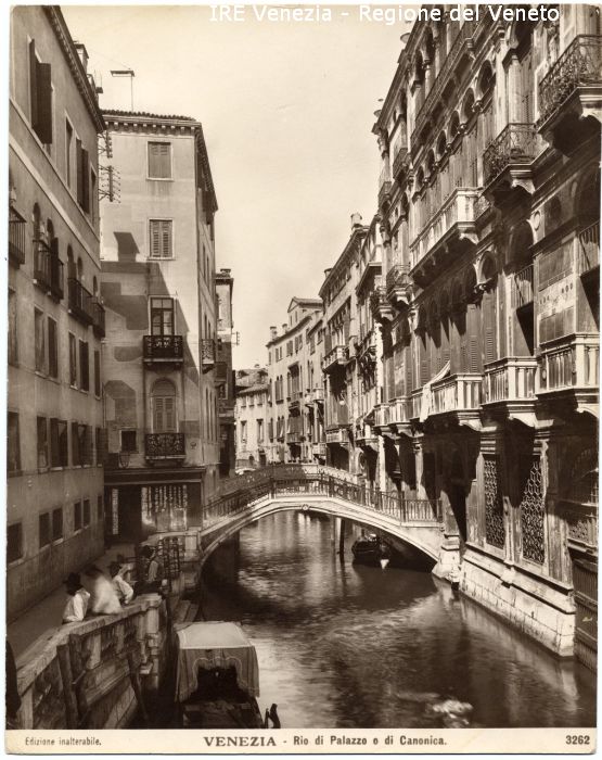 - ISCRIZIONI sul recto: nell'etichetta didascalica sotto l'immagine - Edizione inalterabile./ VENEZIA - Rio di Palazzo o di Canonica./ 3262 - fotografica -