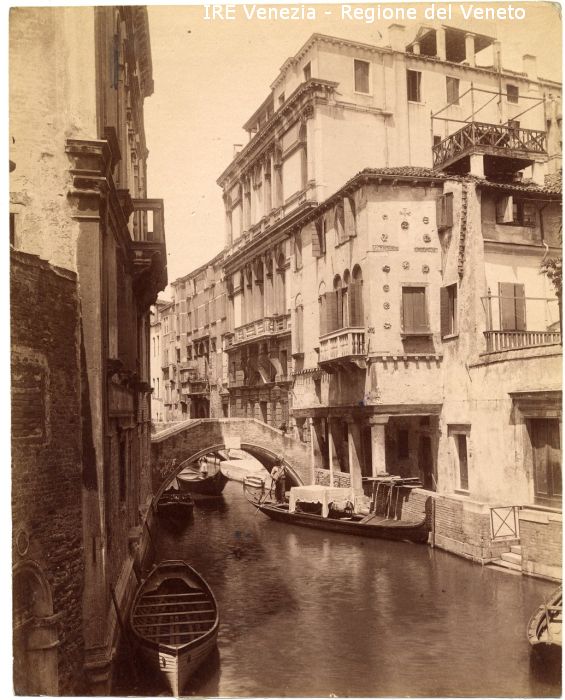 Venezia - Vedute, monumenti, luoghi - Centro storico - Canali e Rii - Castello - Rio di S. Canciano - Palazzo Widman - Uomo sul ponte - Barche - Gondole - Gondoliere che rema