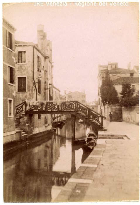 Venezia - Vedute, monumenti, luoghi - Centro storico - Canali e Rii - Dorsoduro - Rio di Ognissanti - Ponte privato con panni stesi ad asciugare - Uomo che cammina - Barche ormeggiate