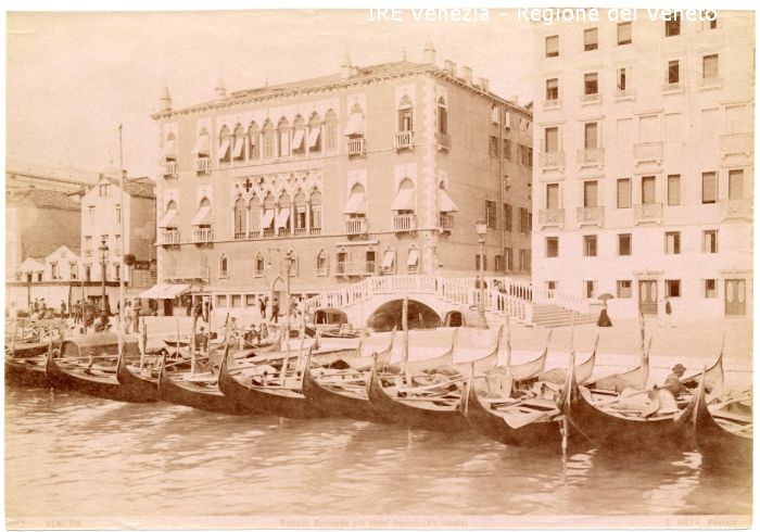 Venezia - Vedute, monumenti, luoghi - Centro storico - Palazzi affacciati su calli, canali, rii - Castello - Palazzo Bernardo o Dandolo (Hotel Danieli) - Ponte del Vin - Persone - Gondole ormeggiate - Gondolieri