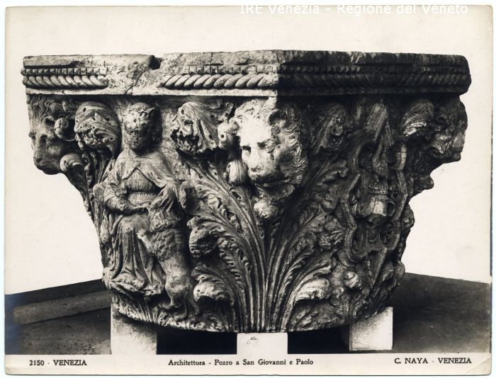 Venezia - Vedute, monumenti, luoghi - Centro storico - Vera da pozzo a S. Giovanni e Paolo - Decorazione scolpita: figure antropomorfe e zoomorfe, donna con la testa cinta da corona che accarezza un leone, foglie d'acanto