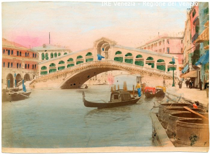 Venezia - Vedute, monumenti, luoghi - Centro storico - Canal Grande - Ponte di Rialto - Riva del Ferro - Pontile di Rialto - Persone - Gondole - Gondolieri che remano