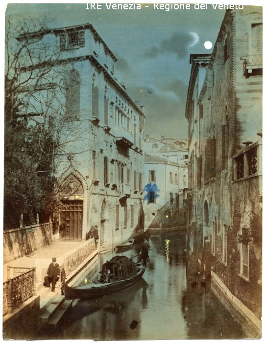 Venezia - Vedute, monumenti, luoghi - Centro storico - Canali e Rii - Castello - Rio delle Erbe o Van Axel - Palazzo Van Axel - Persone - Barca ormeggiata - Gondola - Gondoliere che rema