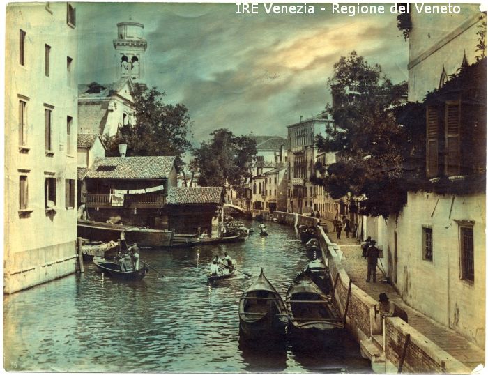 Venezia - Vedute, monumenti, luoghi - Centro storico - Canali e Rii - Dorsoduro - Rio di S. Trovaso o delle Maravege - Squero di S. Trovaso - Persone - Pittori che dipingono vedute - Barche - Uomini che remano