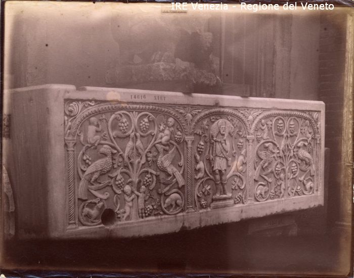 Decorazione scolpita: pastore con agnellino sulle spalle, bambini, figure zoomorfe, grifi, tralci di vite - Numerazione sulla lastra: 14616 XIET