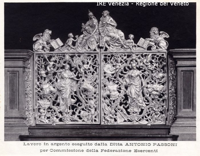 - ISCRIZIONI sul recto: nell'etichetta didascalica sotto l'immagine - Lavoro in argento eseguito dalla Ditta ANTONIO PASSONI/ per Commissione della Federazione Esercenti - Filippi, Tomaso - a matita -