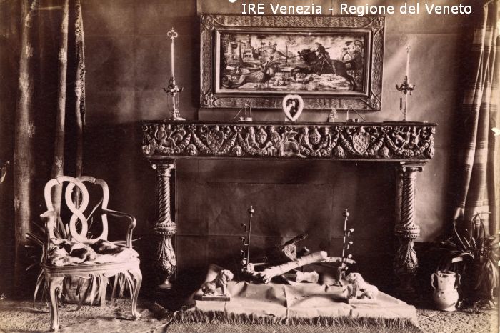 Venezia - Vita veneziana e lagunare - Attività private - Laboratori e Ditte di "Specialità veneziane" - Artigianato: varie - Miss H. G. Macy - Interni della casa-atelier - Sala con caminetto - Quadro del Carpaccio: "S. Giorgio che uccide il drago"