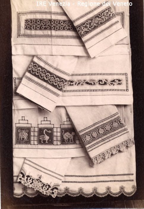 Venezia - Vita veneziana e lagunare - Attività private - Laboratori e Ditte di "Specialità veneziane" - Merletti, campionari anonimi vari - Biancheria di merletto: asciugamani, tovagliette