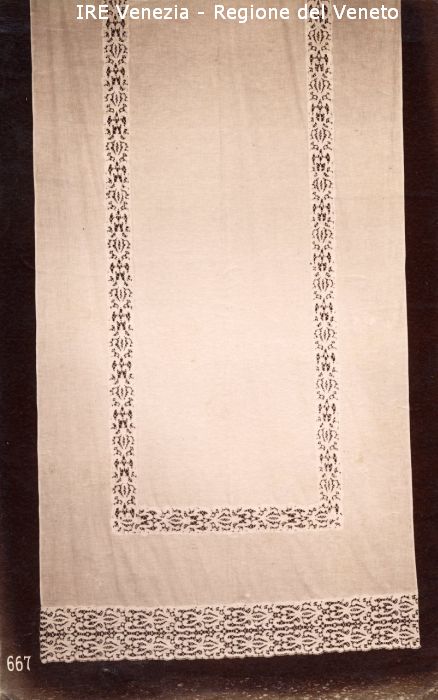 Venezia - Vita veneziana e lagunare - Attività private - Laboratori e Ditte di "Specialità veneziane" - Merletti, campionari anonimi vari - Tenda a pannello con intarsio