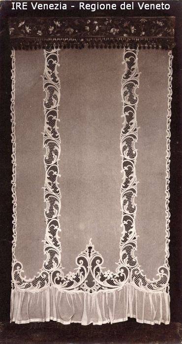 Venezia - Vita veneziana e lagunare - Attività private - Laboratori e Ditte di "Specialità veneziane" - Merletti, campionari anonimi vari - Tenda a pannello montata con mantovana