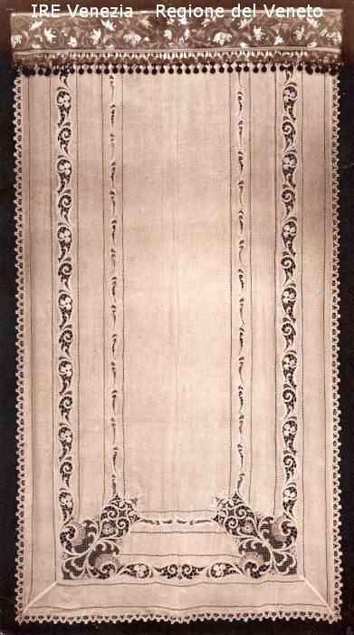 Venezia - Vita veneziana e lagunare - Attività private - Laboratori e Ditte di "Specialità veneziane" - Merletti, campionari anonimi vari - Tenda a pannello montata con mantovana