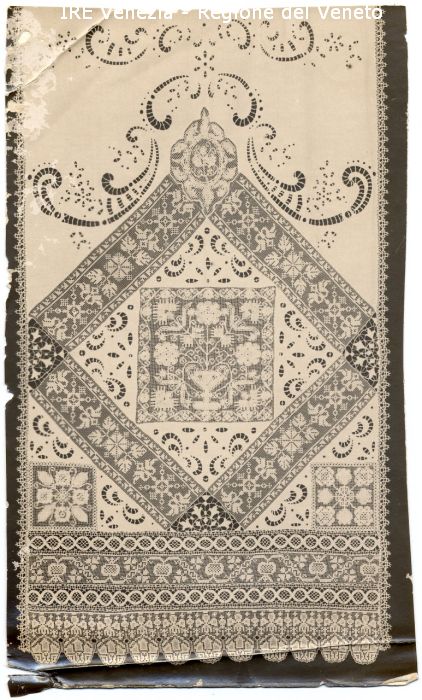 Venezia - Vita veneziana e lagunare - Attività private - Laboratori e Ditte di "Specialità veneziane" - Merletti, campionari anonimi vari - Tenda a pannello con ricamo e intarsio