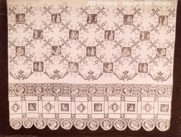 Venezia - Vita veneziana e lagunare - Attività private - Laboratori e Ditte di "Specialità veneziane" - Merletti, campionari anonimi vari - Tenda a pannello con ricamo e intarsio