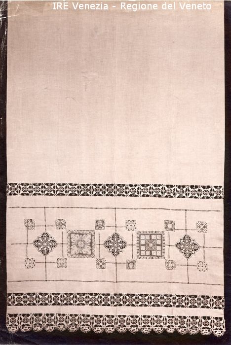 Venezia - Vita veneziana e lagunare - Attività private - Laboratori e Ditte di "Specialità veneziane" - Merletti, campionari anonimi vari - Tenda a pannello con ricamo e intarsio