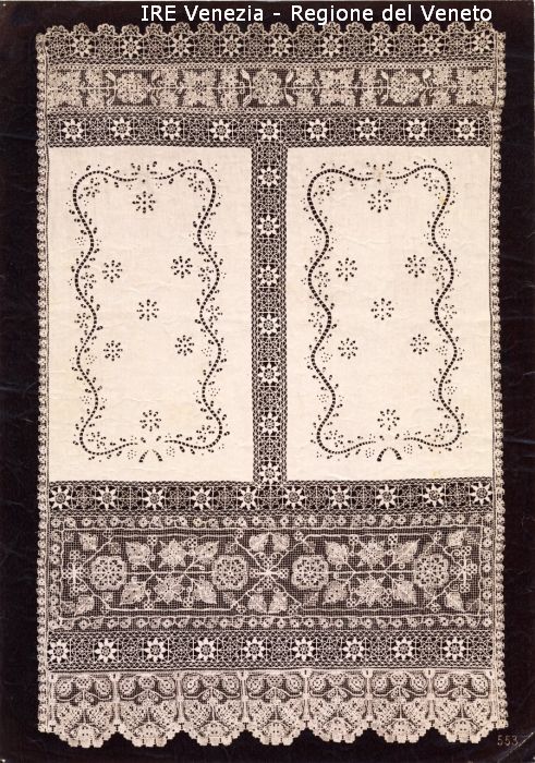 Venezia - Vita veneziana e lagunare - Attività private - Laboratori e Ditte di "Specialità veneziane" - Merletti, campionari anonimi vari - Tenda a pannello con ricamo e intarsio