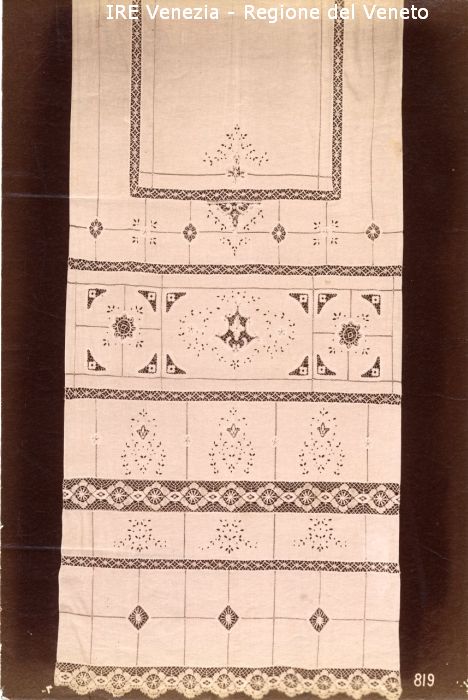 Venezia - Vita veneziana e lagunare - Attività private - Laboratori e Ditte di "Specialità veneziane" - Merletti, campionari anonimi vari - Tenda a pannello con ricamo e intarsio