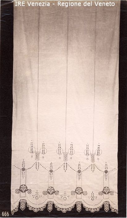 Venezia - Vita veneziana e lagunare - Attività private - Laboratori e Ditte di "Specialità veneziane" - Merletti, campionari anonimi vari - Tenda a pannello con ricamo e intarsio